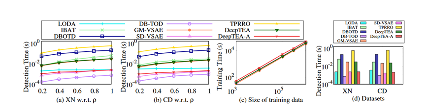 论文评估了图 4 (d) 中所有数据集上所有方法的完整观察的一条轨迹的平均检测时间从图 4 (d) 中,可以看出:(1) DB-TOD 在 XN 和 CD 数据集上以最快的速度检测异常值。原因是 DB-TOD 通过在训练阶段最大化似然来学习具有线性函数的参数。并且学习到的参数在在线检测阶段只需要一个快速的线性运算,这只依赖于他们模型中的少量参数。 (2) 方法 LODA、SD-VSAE 和本文的近似版本 DeepTEA-A 比其他方法执行得更快,只有 DB-TOD 除外。原因是 LODA 集成了一些弱分类器,它们是快速线性函数。作为 DB-TOD,线性函数对于在线检测非常有效。而且线性函数的数量并不多。对于 SD-VSAE,它通过将 k 次最可能的潜在路径计算替换为仅按起点和目标位置计算一次来降低计算成本。 SD-VSAE 在线检测的计算成本为 O(1)。尽管本文的近似方法考虑了旅行期间交通状况的更多信息,但本文通过基于出发时间的交通状况来近似潜在交通模式来减少其时间成本。论文的近似方法在线检测的时间成本也是 O(1)。 (3) 大多数基于度量的方法在线检测的速度较慢,例如 DBOTD、IBAT 和 TPRRO。他们通常需要根据密度或距离度量从数据集中为给定的起点、目的地位置和旅行时间找到正常的时间相关的正常路线。然而,这些步骤对于在线检测来说通常很耗时。他们需要首先提取时间相关的正常路线,然后通过预定义的阈值将测试轨迹与时间相关的正常路线进行比较。 (4) 近似方法DeepTEA-A 的检测时间比DeepTEA 快。原因是论文通过在训练阶段使用协同训练网络仅根据出发时间的交通状况来学习潜在交通模式的参数,从而减少了标准方法的时间成本。学习到的参数可以直接用于在线检测异常值,而无需在轨迹动态移动时更新潜在交通模式。