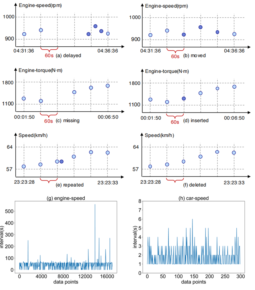 图一是一个真实场景的情况,展示了车辆场景中(a)、(c)和(e)中的不规则间隔时间序列的三个例子,以及它们在(b)、(d)和(f)中的相应修复。图1(g)为引擎速度的连续数据的时间间隔。大多数都在60秒左右。但是,由于数据噪声极大,图1(h)中汽车速度数据的间隔很难确定。