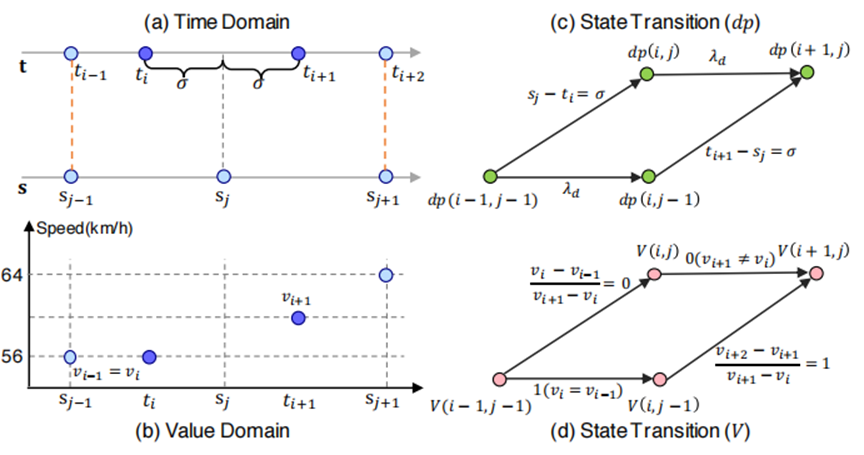 但是仅使用动态规划会导致得到多个不同的匹配项,所以引入数据值的特征来做出进一步的决策。图3(a)是需要进一步决策的操作的示例,这种情况下删除任何一个ti的修复成本的都是相同的。但是在图3(b)中𝑣𝑖−1 = 𝑣I 代表着可能是重复点。所以为了更好的判断,文章加入了一个状态转移矩阵,随着dp的更新一起更新,这样来更好的进行决策。