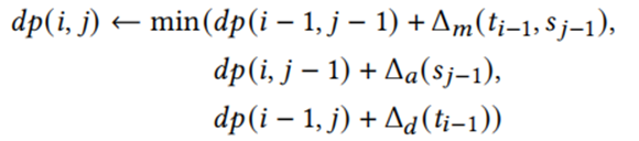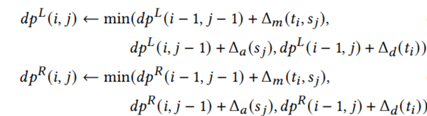 本文针对匹配和修复代价,设计了一种基于动态规划的匹配搜索问题的多项式时间算法。状态转移方程如下: