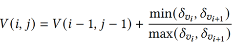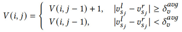 对于延迟的数据,需要选择值的波动𝛿𝑣𝑖 = |𝑣𝑖 − 𝑣𝑖−1 |更加接近的情况,即ti前后的值波动𝛿𝑣𝑖 和𝛿𝑣𝑖+1更加近似,因此按照如下公式进行更新V(i,j):