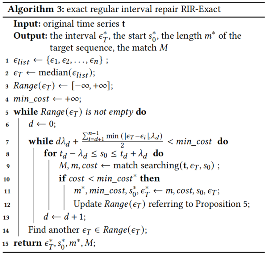 本文将规则间隔时间序列的时间戳修复问题形式化,最小化移动、插入和删除操作的成本。设计了一种基于动态规划的精确方法,寻找具有最小距离代价的不规则区间时间序列与规则区间时间序列的匹配,并确定规则区间时间序列的长度。并设计了一种基于双向动态规划的近似算法,显著降低了时间成本。文章对各种现有的方法进行了全面的评估,在修复的时间戳和下游任务中,例如,频域分析和数据压缩。