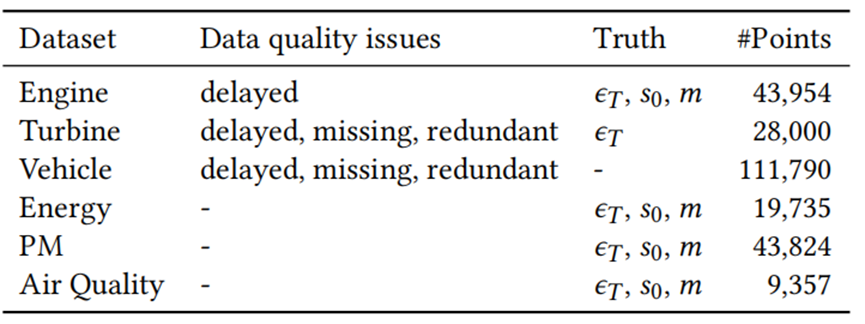 表1 数据集的特性。Dataquality issues是指存在于原始数据集中的数据质量问题。Truth表示我们拥有的数据集的真实参数。