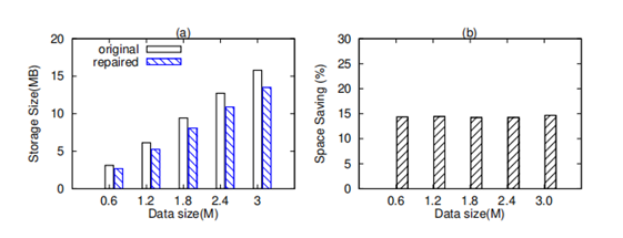 在压缩处理实验中,文章使用时间序列数据库存储0.6万-300万个数据点的原始和修复的时间序列数据。对于每个尺寸,文章将数据插入到数据库中,并记录存储空间的增加。图5显示了存储空间的结果和间距时间比。由于deltaof delta原理,规则的间隔时间序列(时间戳上的delta of delta为0)占用最小的存储空间。如图5(b)所示,Space Saving Ratio稳定地保持在15%左右,也就是说,规则的间隔时间戳被有效地压缩。