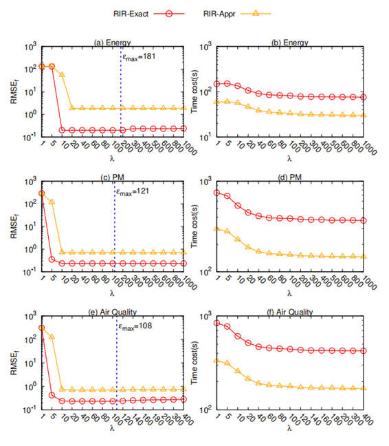 总的来说,RIR-Exact和RIR-Appr是稳定的,当λ足够大时,它们对λ不太敏感。在能源和空气质量方面,当λ>ϵmax时,由于一个更大的λ可能会使删除和插入变得困难,RIR-Exact或RIR-Appr的RMSEf开始有所增加。从图6还可以看出,由于一个更大的λ可能会引入更少的删除和插入,从而减少匹配M的长度,使得时间成本会随着λ的增长而减少。根据评估,λ=ϵmax可以平衡准确性和时间成本。