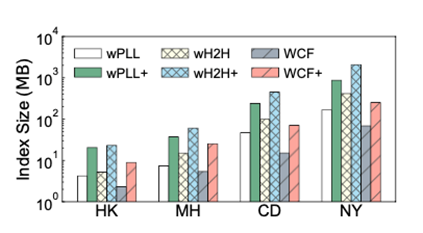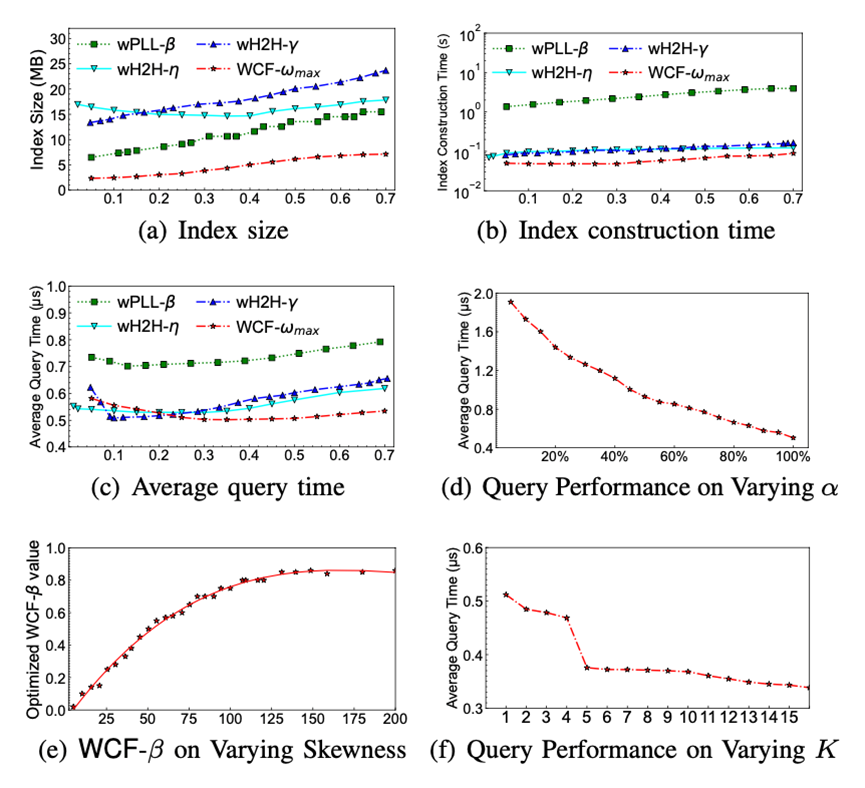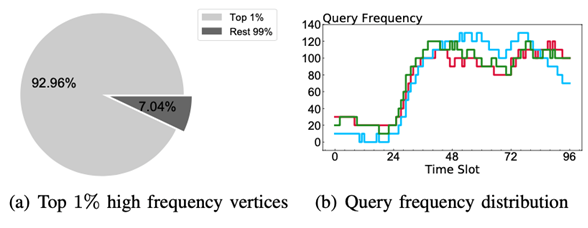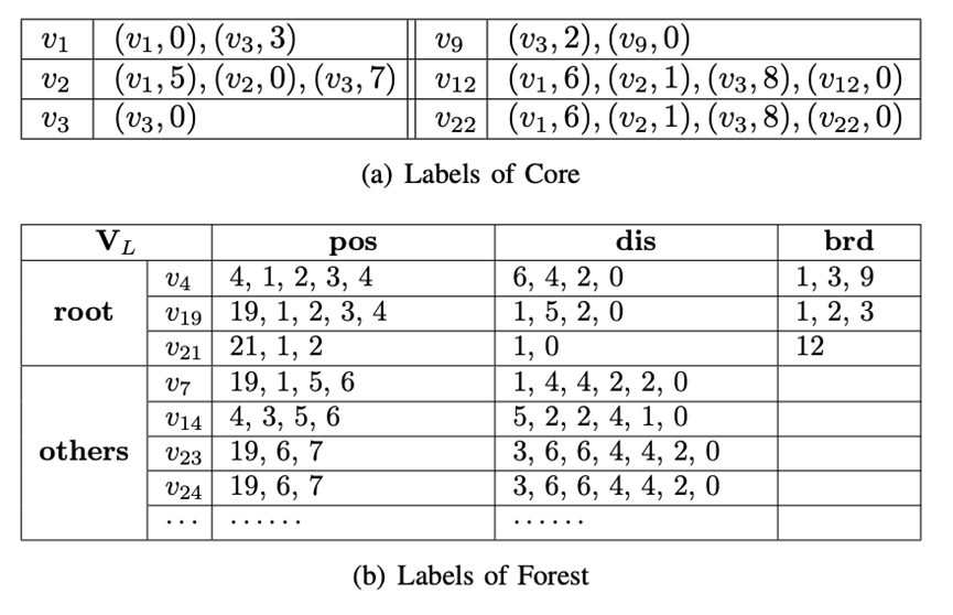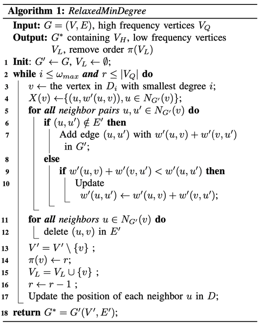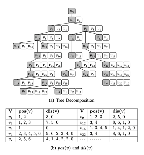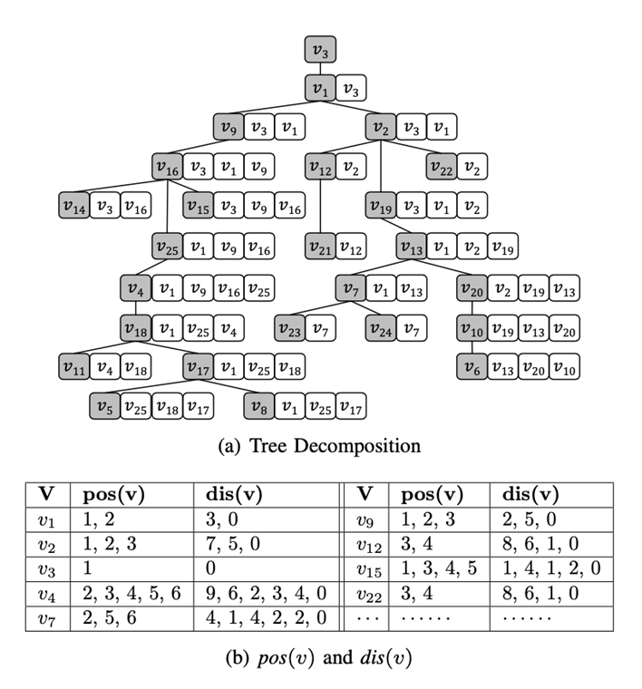 ,其中dv*=dv / dmax,γ是平衡参数,Bi是vi所属的区块。此处提到的区块是由论文提出的区块分区技术生成的,之所以引入区块分区技术,是因为如果像σ(v) = γ⋅fv* + (1 - γ)⋅dv*这样直接地引入频率参数,将会导致生成的树分解高度和宽度都比原MinDegree方法生成的大,从而造成额外空间开销。引入区块分区技术之后,所有顶点被分成N = ⌈n/η⌉个区块,每个区块的最大大小为η,然后区块按照由度数和查询频率决定的顺序处理,对于一个区块内的顶点,则按照顶点度数的顺序处理。