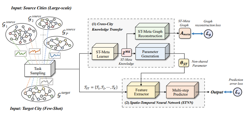 时空图学习是交通流量、出租车需求、空气质量预测等城市计算任务的关键方法。由于数据收集成本高,一些发展中城市的可用数据很少,这使得训练一个性能良好的模型是不可行的。为了应对这一挑战,跨城市知识迁移已显示出其前景,从数据充足的城市中学习到的模型被用于数据稀缺的城市的学习过程。然而,不同城市间的时空图结构不规则、特征多样,限制了现有少样本学习(