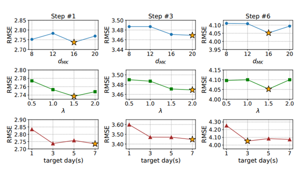 = 16时,在短期和长期预测中都获得了更好的性能。此外两个损失函数之间的权衡也很重要,论文发现当