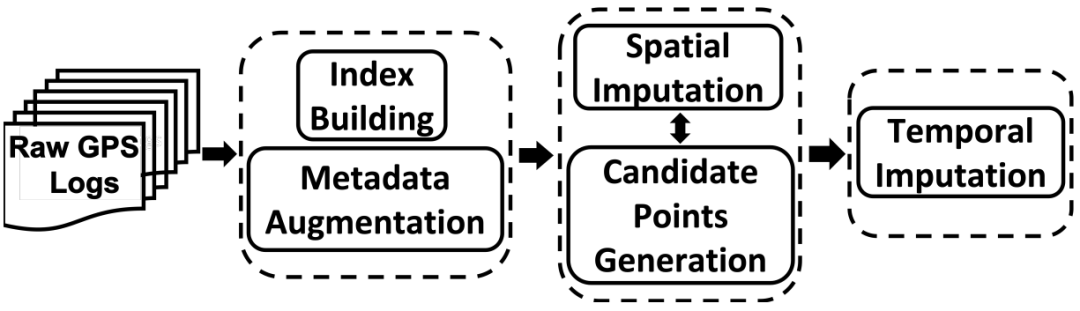 图1为论文提出的TrImpute框架的结构。TrImpute的输入是一组原始的GPS点,其中每个点P的格式为<TrajID,PointID,latitude,longitude,timestamp>。输出会有同样的格式,但是会有更多的点,因为在同一轨迹的每两个原始点之间会插入更多的人工推算点。在TrImpute中,输入要经过三个主要部分,即预处理、空间插补和时间插补。