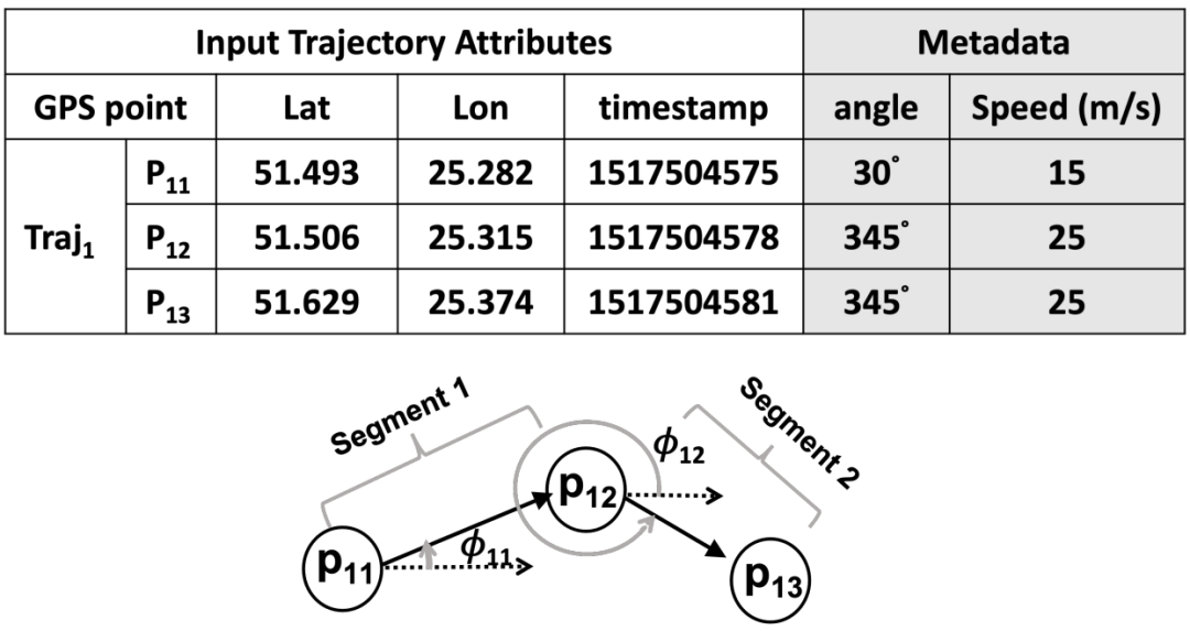 (2)角度和速度推断:TrImpute依靠输入的GPS点的角度和速度信息来指导其推算过程。然而,这种信息并不直接可用。因此,论文利用轨迹倒排列表来推断每个轨迹点的角度和速度,如图2所示。