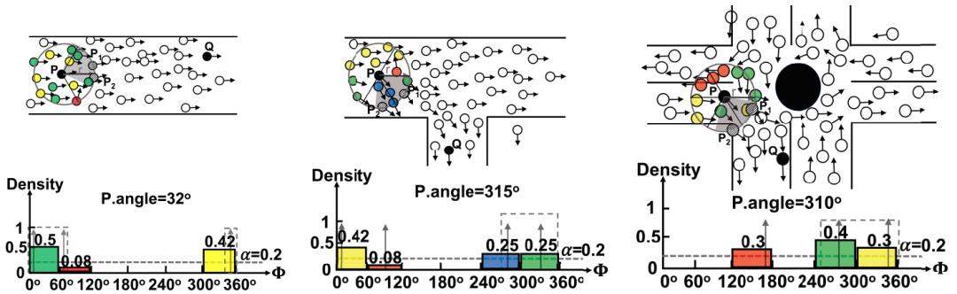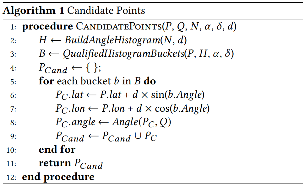 的范围内。然后,论文使用参数α和β排除那些不符合第二和第三项属性的桶,即那些人群比例小于或其平均角度不在P的角度之内的桶。对于剩下的桶,论文在桶角度的方向上,在距离P的距离d内,为每个桶生成一个候选点。论文将该候选点的角度设定为目标点Q的方向。