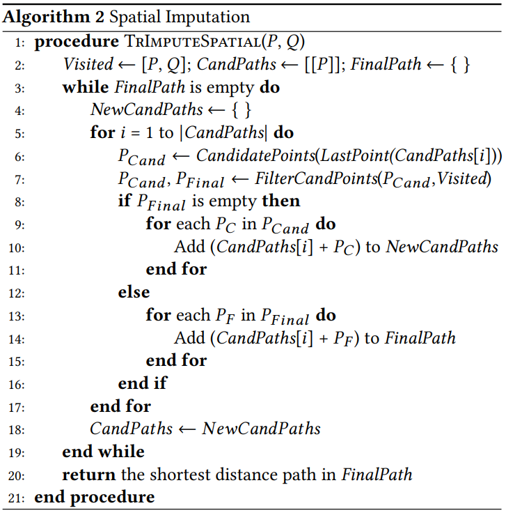 (2)空间插补:算法2给出了空间插补过程的伪代码,输入是起始点P和目的点Q,输出是由一组候选点组成的路径。首先通过起始点和目的点初始化访问点集合,该集合将用于存储所有候选路径的访问点,当前的候选路径只有一条由起始点组成的长度为1的路径,以及空的路径集合。对于每个迭代i,考虑那些长度为i的候选点的路径。在每次迭代中,对每条路径调用一次候选点算法(算法1),使用当前候选路径列表中每条路径的最后一个点。然后,论文调用一个名为FilterCandPoints的程序:(a)从候选点集合中删除那些与任何先前访问过的点有距离的点;(b)用候选点集合中与目的地Q有距离的点的集合填充一个新的列表PFinal。因此,生成新的|CandPaths|候选路径,为候选点集合中的每一个候选点生成一条路径,用候选点增加当前的i个点的路径,形成一条有i+1个点的新路径。同时,如果PFinal不是空的,就可以知道有一条可能的插补路径。因此,算法形成一个FinalPath集合,由|PFinal|路径组成,每条路径都是由PFinal中的每一个点对当前路径进行增强而形成的。该算法的结果是返回FinalPath中的最短路径。