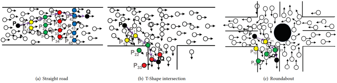 图4给出的直路、T型交叉口和环岛的从P到Q的完整推断路径。以直路的情况为例(图4(a)),第一次迭代将在P点上执行,其中返回两个候选点P11和P12(用黄色描述)。现在,论文在第二次迭代中有两条可能的路径需要考虑,即[P, P11]和[P, P12]。对这些路径中的每一条应用候选点程序,都会为第一条路径返回两个候选点,为第二条路径返回一个候选点(以绿色显示)。到目前为止,论文有三条可能的路径:[P, P11, P21], [P, P11, P22]和[P, P12, P24]。按照同样的方法,第三次迭代得到四个候选点(红色显示),第四次迭代得到五个候选点(蓝色显示),这样论文就有五个可能的路径。没有必要进行第六次迭代,因为论文已经有两个候选点P41和P42与Q的距离在d之内,这给了论文两个可能的推断路径,论文选择其中最短的路径。[P, P11, P21, P31, P42, Q]。