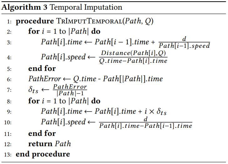 本文介绍了TrImpute,一个新颖的轨迹推算框架,它有能力推算稀疏的轨迹数据,而不需要了解底层道路网络,因此它被认为是一个无网络的轨迹推算框架。由于缺乏对道路网络的了解,TrImpute依靠附近的人群智慧来指导其推断过程。基本上,对于空间中的每一个点,都会提出一个候选点的列表,其中任何一个都可能是下一个插值的点。然后,TrImpute将每个轨迹段的空间推算过程正式化为:找到轨迹段终点之间最短的连续候选点集合。TrImpute接着进行时间插补,空间插补的点由遵循轨迹段端点的时间戳信息来注释。基于真实数据和部署的大量实验结果表明,TrImpute具有高度的可扩展性和准确性,并能极大地提高轨迹应用的性能。