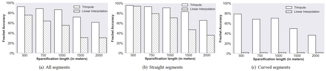 图5(a)描述了从500米到2,000米稀疏长度对TrImpute和线性插值的精度的影响。正如预期的那样,准确度随着稀疏长度的增加而降低,因为推算轨迹的难度大大增加。然而,这里有两件重要的事情需要注意。(1)在所有的稀疏长度中,TrImpute都比线性插值准确,(2)TrImpute和线性插值之间的性能差距随着稀疏长度增加而显著增加。这表明TrImpute可以维持较高的稀疏度,而线性插值在1,500米稀疏度的情况下,其精度急剧下降到30%。图5(b)和5(c)对TrImpute和线性插值之间的性能差距进行了更仔细的观察,其中精度是基于将不同拼接长度的路段分别归为直线和曲线。论文使用原始轨迹数据来识别弯曲的路段,即一组5个连续点的角度差异超过一定的阈值。如果这些连续点的角度大致相同,论文就认为该段是直线。否则,该段被认为是弯曲的。图5(b)比较了只考虑直线段时TrImpute和线性插值的精度。虽然,TrImpute在所有的稀疏长度中仍然持续优于线性插值,但线性插值的表现并不差。事实上,线性插值仍然工作得很好,特别是对于低疏散度值,500米疏散度的准确率达到90%以上。这是意料之中的,因为线性插值对直路来说是一个可以接受的解决方案。线性插值在2,000米间距的准确度为30%,这是因为道路上的车道变化,线性插值不能捕捉到这一点,而TrImpute仍然能够得到它。这显示了TrImpute对高稀疏长度的稳健性。图5(c)专门对弯曲的路段进行了同样的实验。很明显,即使是在最低的500米的间隔长度上,线性插值也明显失败,只有2%的精度。同时,TrImpute仍然保持着较高的精度,但随着拼合度的提高,精度会越来越低。