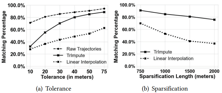 图6评估了TrImpute和线性插值的OSM精度。在这种情况下,匹配标准是通过寻找离每个GPS点最近的片段来完成的。匹配度越高越好,因为它表明推断的点是真实的点。作者认为,如果一个点在50米的公差距离内,那么它与地图的匹配度就很高。图6(a)给出了公差值从10米到75米变化的影响。作为参考,作者还绘制了原始轨迹数据的OSM准确性,显然,即使原始数据在任何容差下都不是100%匹配。这是由于任何此类收集到的真实数据的固有噪声所预期的。显然,如果有更多的容差,TrImpute和线性插值都会做得更好。然而,我们可以看到,TrImpute的表现一直优于线性插值,而且随着容差值的增加,差距实际上在扩大。图6(b)给出了拼合距离从750米到2000米变化的影响。更多的疏散距离会使精度大大降低。然而,我们可以看到,与线性插值的趋势相比,TrImpute的精度下降是合理的。特别是,即使有1500米的稀疏,TrImpute仍然能够得到80%的精度,是线性插值40%精度的两倍。