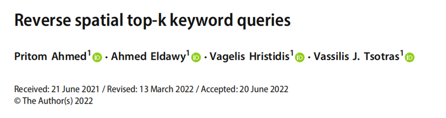 [1].Ahmed P, Eldawy A, Hristidis V, et al. Reverse spatial top-k keyword queries[J]. The VLDB Journal, 2022: 1-24.