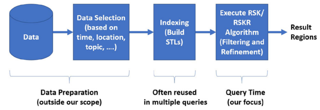 论文首先使用现有的算法对帖子进行筛选,比如根据空间、时间、关键字等进行筛选。在筛选出数据后,使用网格索引对数据进行索引。当改变查询的关键字时,不需要重建索引,但是筛选帖子的条件进行变化时,需要重建索引。系统架构图如图 1所示: