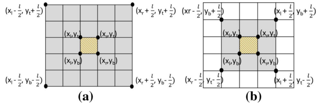 令lmin为支持的l的最小值,那么,网格的长度c必须满足c <= lmin 2,这是为了能够更好地筛选出一定满足约束的网格以及一定不满足约束的网格。令ηH =⌈l / 2c⌉,ηL =⌊l / 2c⌋。定义网格Ci,j的保守区域CRi,j为满足i-ηL<u<i+ηL且j-ηL<v<j+ηL的网格Cu,v的集合,网格Ci,j的扩展区域Ei,j为满足i-ηH<=u<=i+ηH且j-ηH<=v<=j+ηH的网格Cu,v的集合。如图 2所示,黄色虚线所在的网格的扩展区域与保守区域分别如(a),(b)中灰色网格所示,其中l=3c。