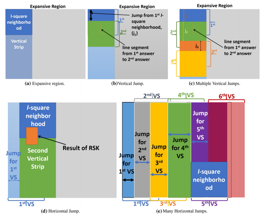 对于RSKR查询,在细化过程中,只要找到一个满足条件的l-square邻域,就可以直接将当前单元格作为答案返回。但是如果当前单元格不存在这样的邻域,那么细化过程依旧十分耗时。为了减小查询延迟,论文提出了一种划分搜索空间的方案。具体步骤为:对于候选单元格,在其中随机选取一点作为l-square邻域的中心,如果该邻域是q的(k, l)邻域,那么停止搜索。否则根据该点将空间划分成四份。对于划分后的四个子空间,论文依旧在其中各随机选取一点,如果找到答案,那么停止搜索。否则计算四个子空间中q的频率与排名第k的频率的差值,取差值最小的子空间进行第二轮迭代计算。当找到结果或者划分次数到达上限时,算法停止。