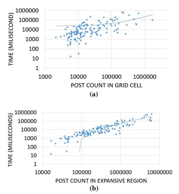 由于特定候选单元格的实际细化时间依赖于查询,直到执行细化步骤后才知道,因此我们希望找到能够准确估计细化时间的指标,或者是预先计算的(即查询独立),或者是在查询时易于计算的指标。论文主要关注四个指标:(a). 帖子数量;(b). 它的扩展区域的帖子数量;(c). 跳跃长度 (d). 它的扩展区域的跳跃长度。论文的实验证明跳跃长度依赖于帖子数量,因此只需要关注(b)和(d)指标。如图 4所示,显然,扩展后的区域的帖子数量与细化时间有更高的相关性,因此论文将其作为估计细化时间的指标。