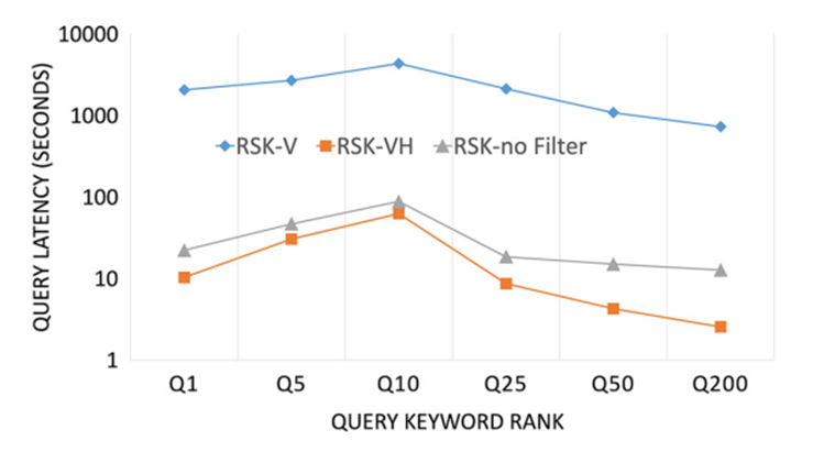 首先来看论文提出的各类方法对RSKR查询的提升,图 6展示了在不同的查询参数k的情况下论文提出的各类算法对查询效率的提升。其中RSK-V是只有水平跳跃的算法,RSK-VH是同时包含水平跳跃和垂直跳跃的算法,RSK-no filter是没有过略步骤的算法。可以看出,水平跳跃的引入极大提升了查询效率,同时,过滤步骤的引入让算法效率提升了1.5-7倍。
