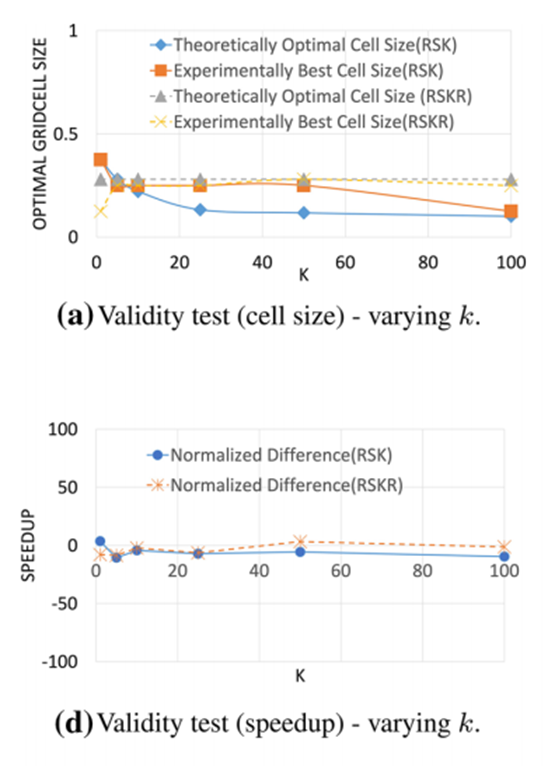 至于论文提出的网格大小的估计策略,图 7展示了论文得到的网格大小与实验得到的最优网格大小的对比,在不同的查询参数k下,估计的网格大小与实验得到的最优网格大小十分相近。同时,(d)表明在使用估计的网格处理查询时,其效率与实验得到的最优网格的效率相近。