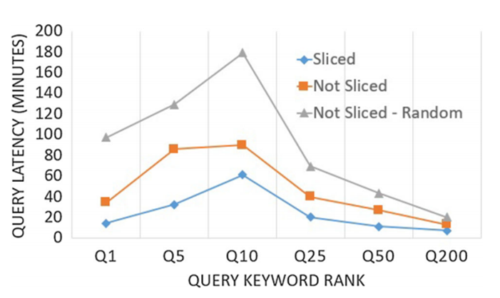 图 7展示了切片算法对于查询性能的提升,可以看出,论文中提出的工作负载划分策略远优于随机划分的策略,同时,切片可以进一步降低查询延迟。