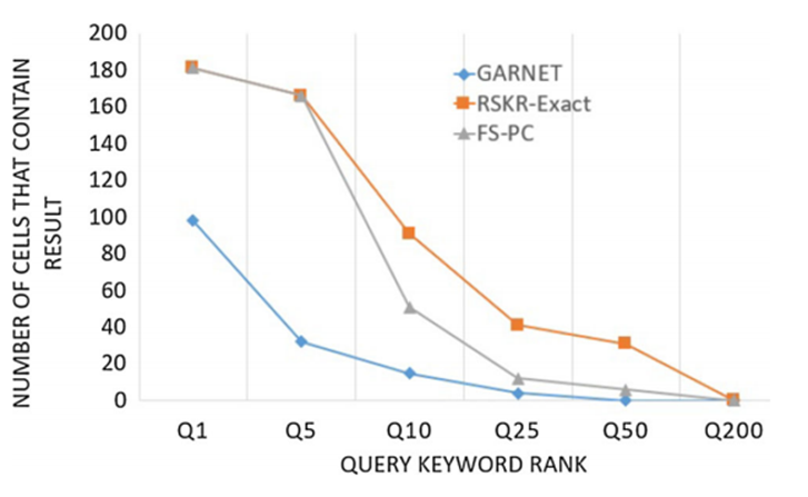 GARNET也研究了RSKR问题,但与论文中不同的是,GARNET限制邻域的大小为网格的大小,同时只有当q是网格的中心点的(k, l)项时才将网格视为答案。图 8展示了在不同的查询参数k的情况下GARNET与论文算法的对比。RSKR-Exact与FS-PC分别为论文对RSKR查询的准确查询算法和估计查询算法。可以看出,GARNET忽略了许多正确的答案,而论文的方法可以检测许多需要的l-square邻域。