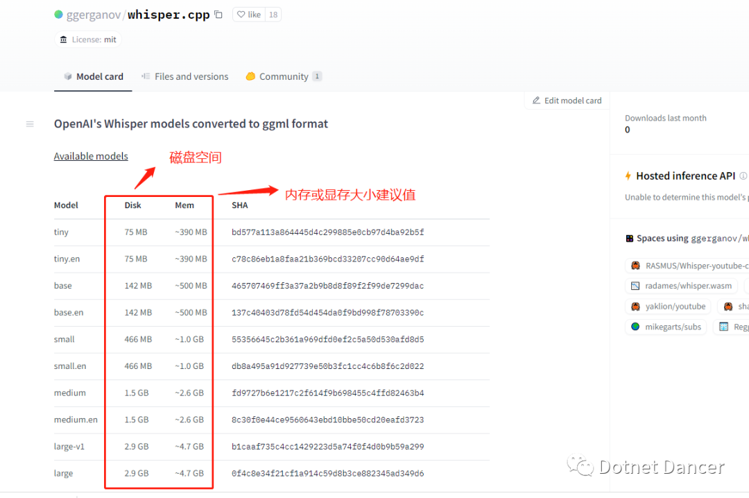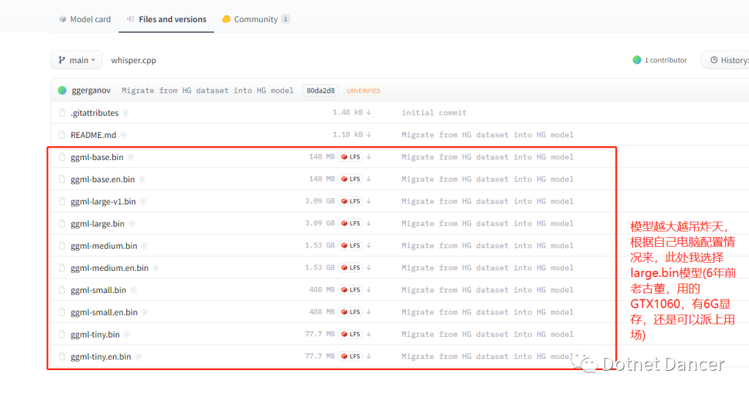 首先,去hugging face网上下载对应的模型,该模型分为几个不同的档次,可以根据自己的电脑配置要求来。例如,显卡显存、或者内存。如果使用CPU计算,可以使用内存,不过准确度会降低;如果使用显卡计算,就会提高很多准确度。同时,模型对显存需求越大,也代表精确越高。