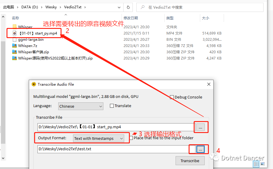 然后选择需要处理的音视频文件,以及选择输出文本样式格式(例如我选择的是带时间线的,每个文本会自带文字信息)和需要保存的文件名称等。