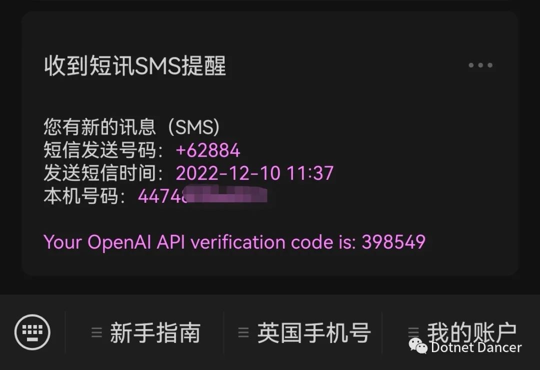 4、这个是我使用该公众号购买英国临时手机号码以后,成功注册 Open AI账号时候的一个验证短信,会通过公众号发送过来。