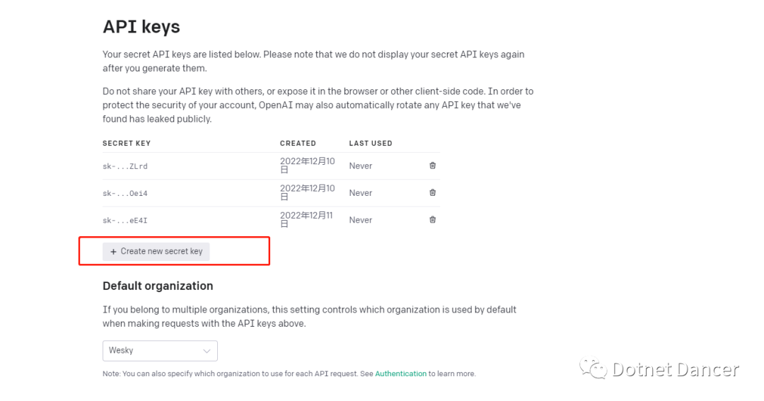 7、创建你的密钥,这个密钥是用来访问Open AI 的API的时候,进行验证使用的。加密方式目测应该是JWT。所以大家感兴趣还可以使用各种不同语言的版本进行访问,此处我比较懒就直接用别人写好的来做。创建好以后,复制密钥备用。