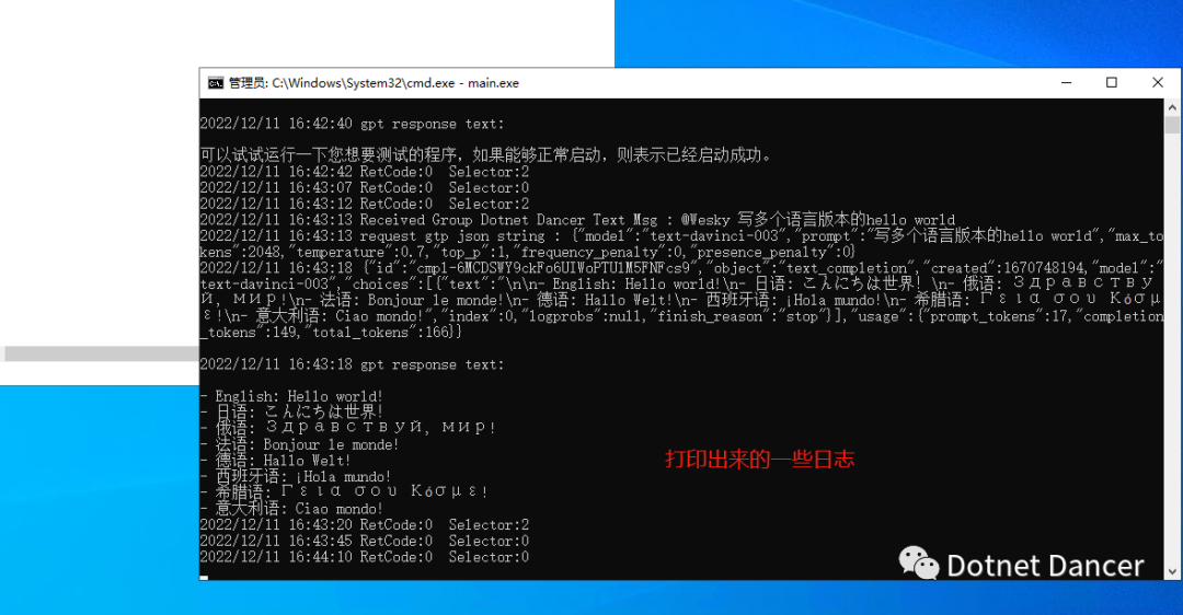 登录完毕以后,此处做了一个测试,发送了一条消息,当做验证,消息内容后台日志如图。