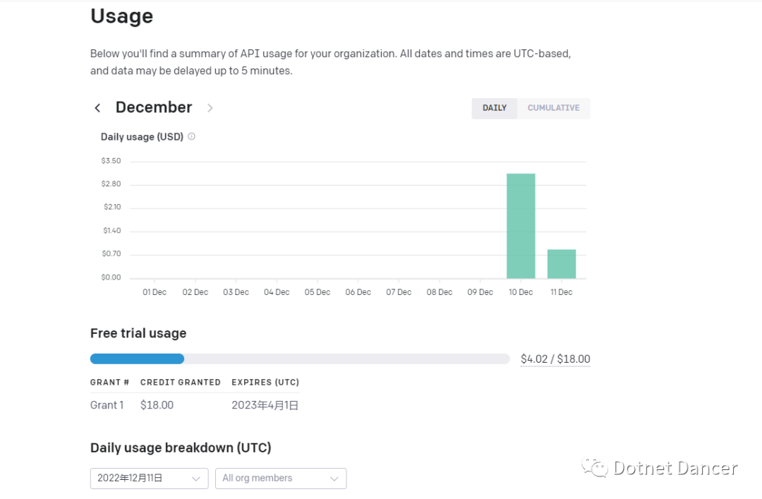 18、Open AI账号新注册用户有18美刀的体验额度。部署一段时间,由于刚开始部署时候,大家在群里玩的比较嗨,所以随着玩的越多,额度就会被扣减掉,例如,一天多已经用完了4美刀多了。不过用来体验到话,是够了的。