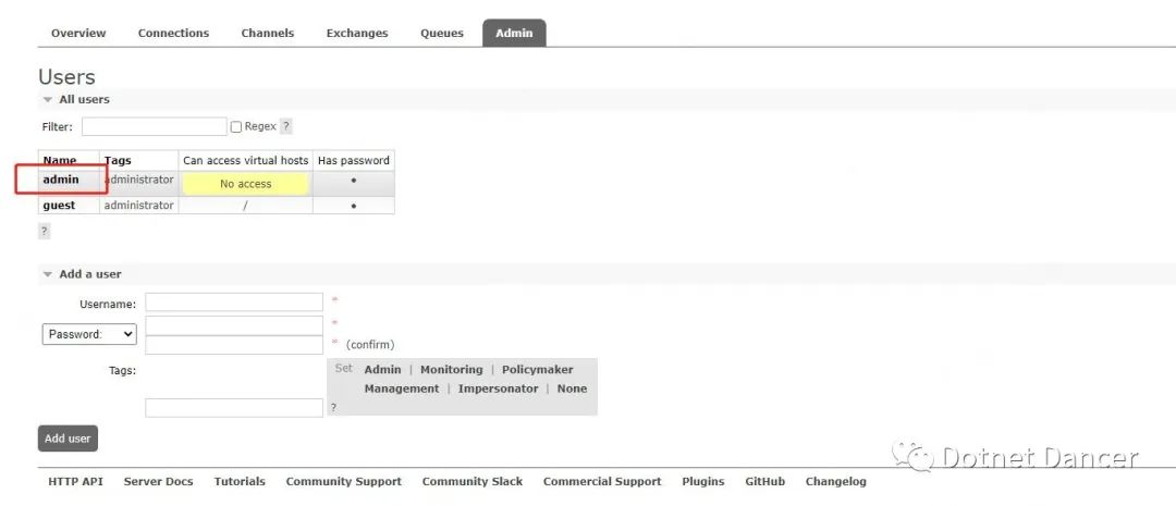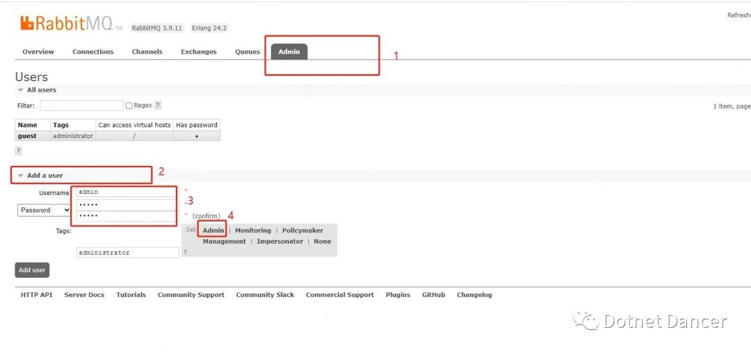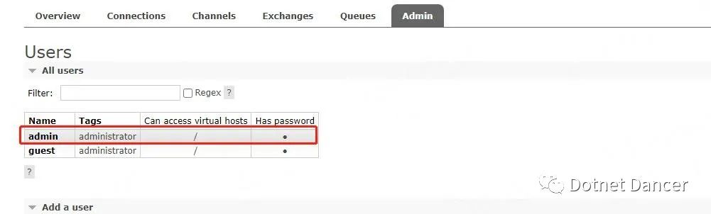 进行添加一个我们的用户。(不建议使用guest 用户直接做消息队列的处理,可能有安全风