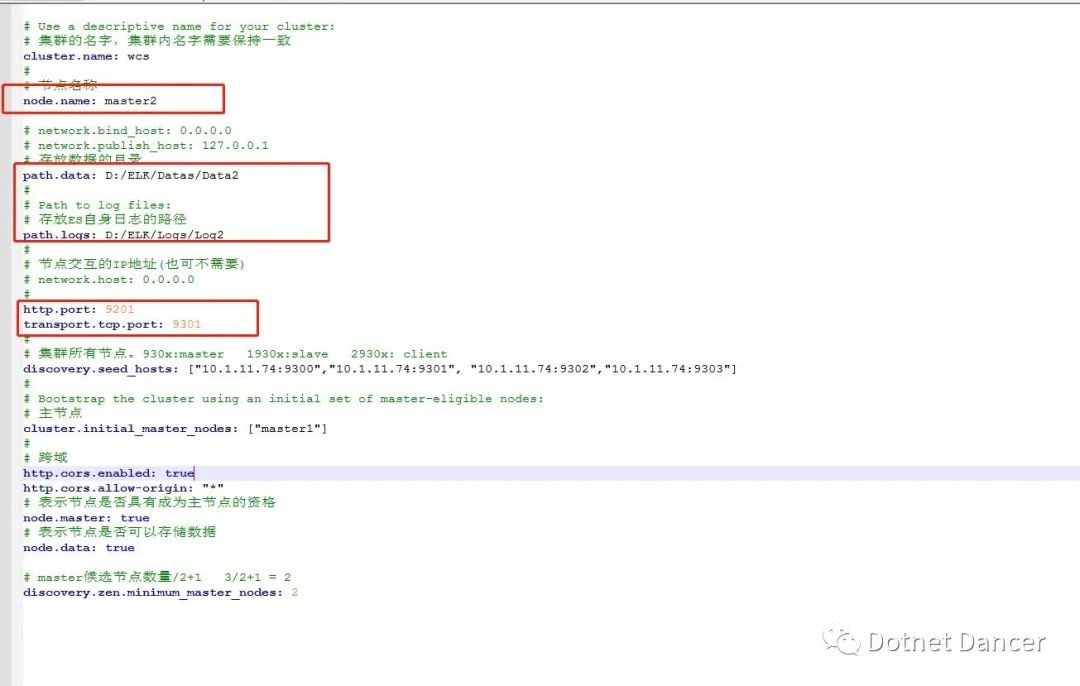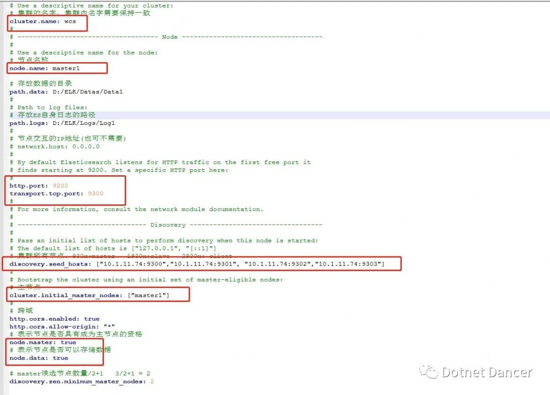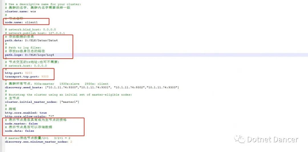 cluster.initial_master_nodes 此处默认主节点设置为master1,当然也可以设为master2或者3,但是不能是client,因为client 不能当做主节点。