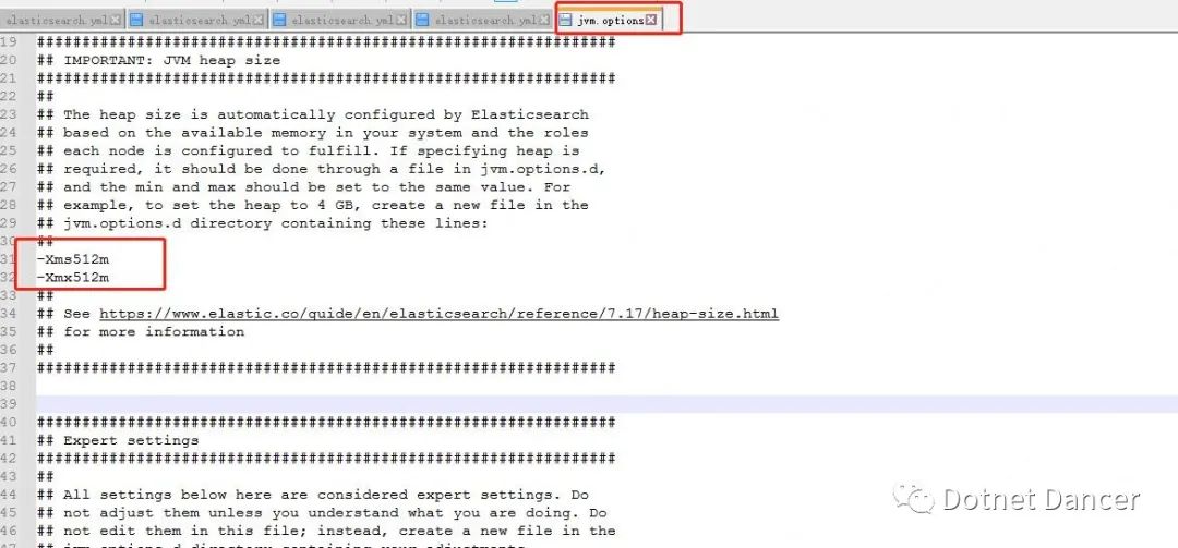 该路径下用来配置单个ES 的内存分配规则。最低可以配置512m,最高32g 此处以最高和最低内存使用量都是512m 来配置(公司云服务器配置太低,没办法~)。如果是g 为单位,注意都是小写,并且不带b,例如Xms512m Xmx4g 等等。Xms 代表最低分配内存,Xmx 代表最大分配内存。