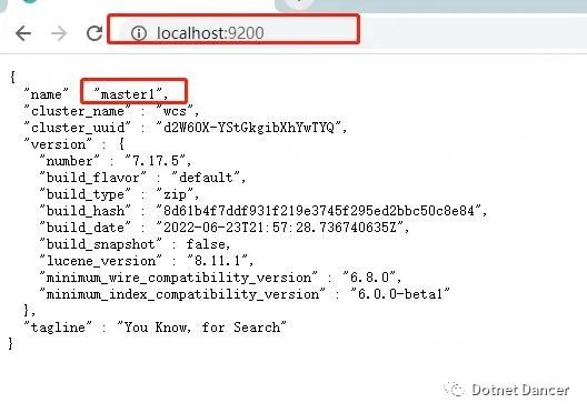 启动以后,浏览器输入localhost:端口号,例如master1 的端口号是9200,启动成功会有一段简单的提示信息,包括节点名称、集群名称,es 版本等等: