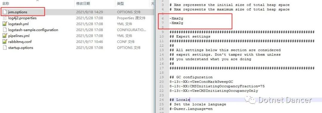 Logstash 的jvm 配置,同elasticsearch 配置,也需要配置最大内存和最小内存的临界值。