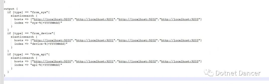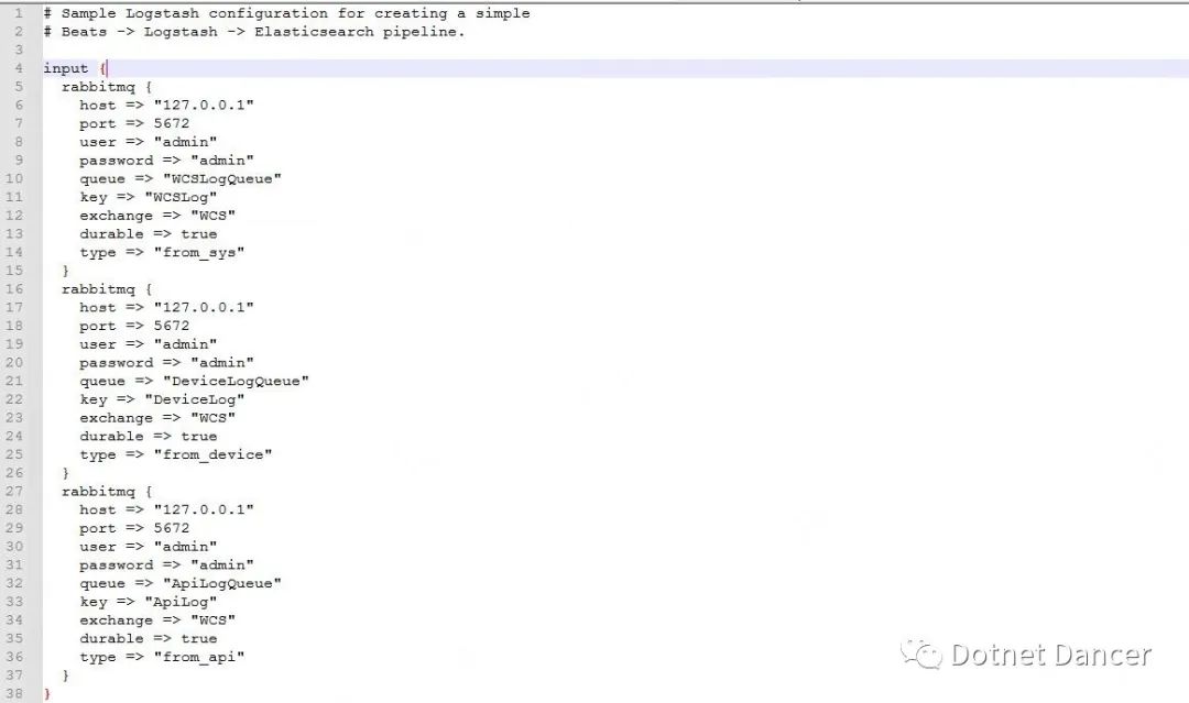 config 文件用于指定logstash 使用何种方式进行监听数据流的输入和输出功能,当前使用监听RabbitMQ 的方式来监听日志数据流,然后进行转存到ElasticSearch 数据库上。