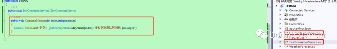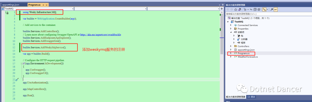然后,在program.cs里面,添加对WeskyMqService的注册,里面注册了基础的生产者和消费者服务。