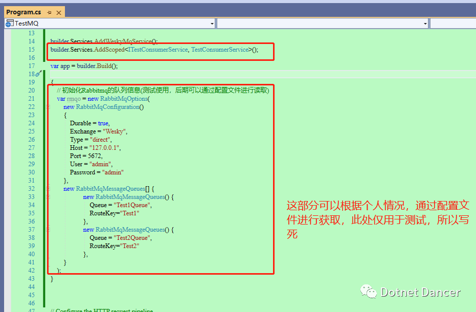 再然后,回到program里面,对刚才新增的方法进行依赖注入的注册;以及在里面做一个简单的MQ队列的配置信息。