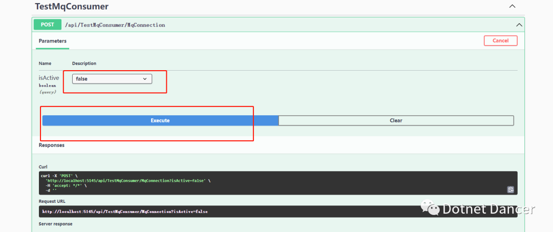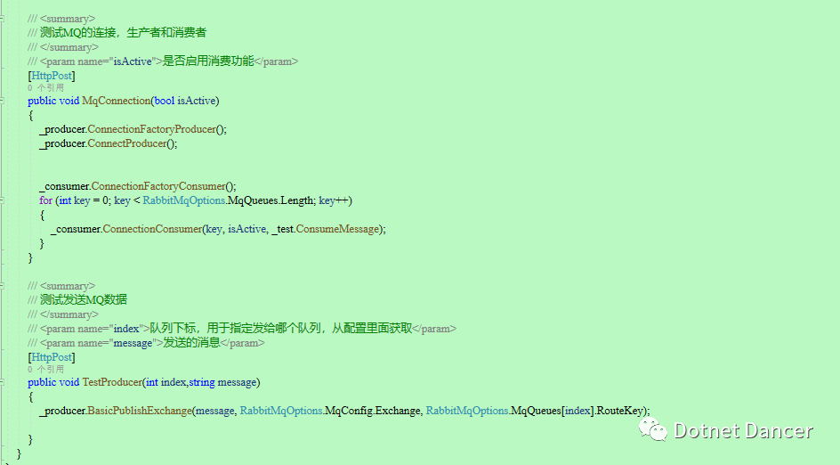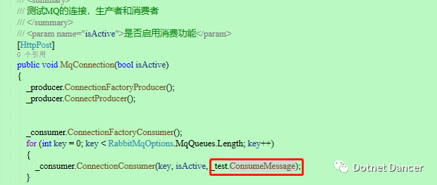 连接参数isActive代表是否消费者消费消息,如果不消费消息,那么就可以用来给我们上面的logstash来消费了;如果消费消息,那么消息就会进入到我们刚才创建的ConsumeMessage方法里面去,因为它通过回调函数参数丢进去了: