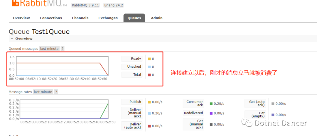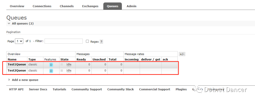 然后再查看MQ面板,可以看到多了两个队列,这两个队列就是代码里面连接以后自动创建的: