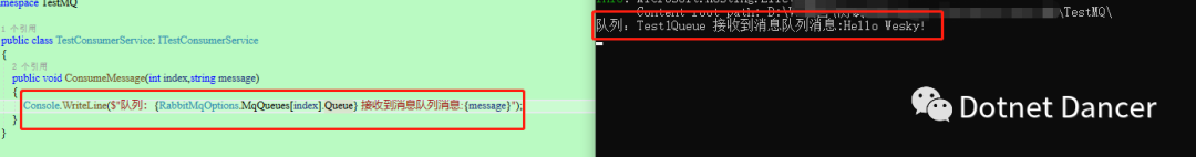我们刚才写的一个输出控制台的消费消息的业务方法,此时也被执行了: