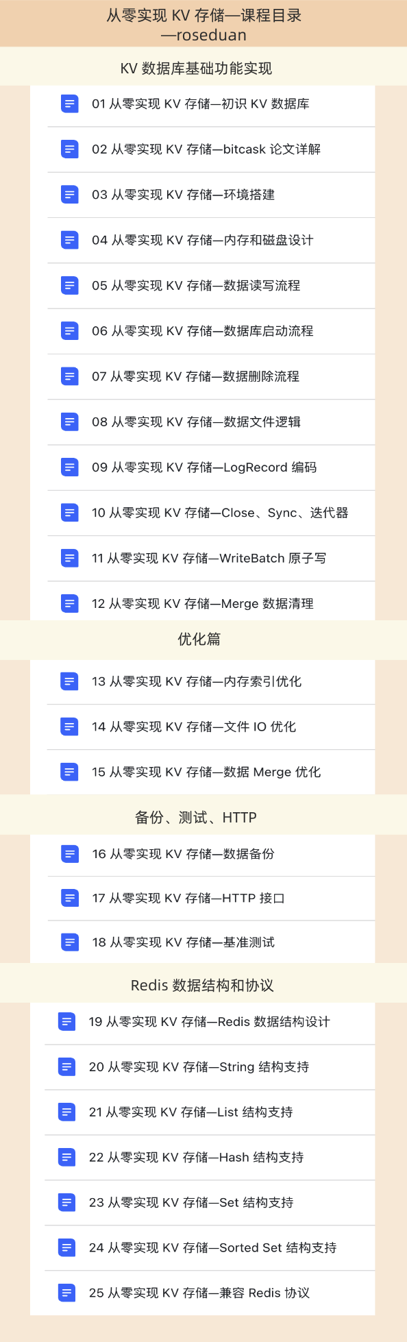 结合自己从 Java 业务开发转行数据库内核的经历,我认为从零实现 KV 存储是一个很好的起点,希望这个课程可以帮助到一部分同学。