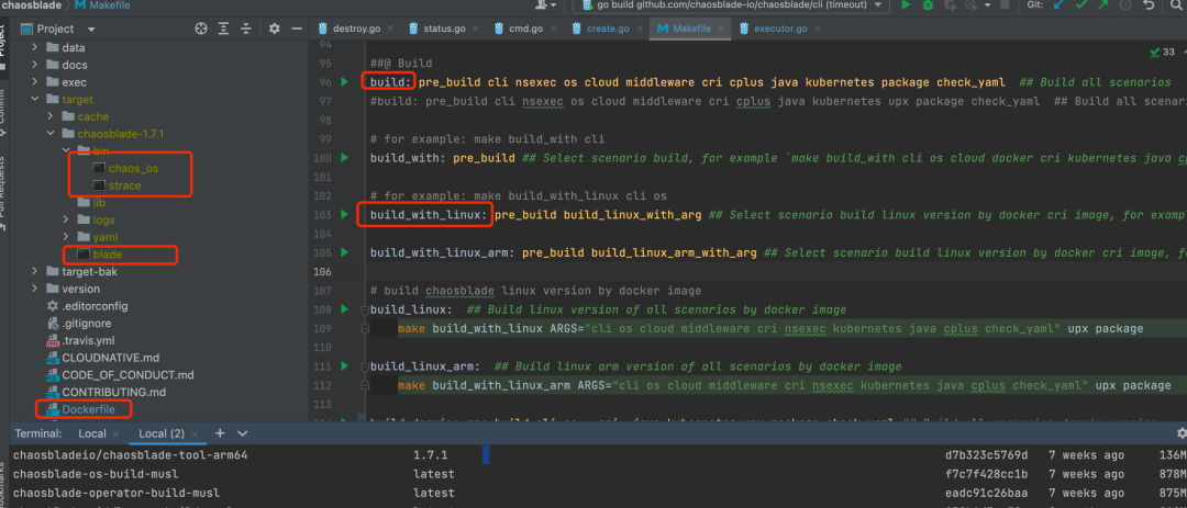 在进行ChaosBlade二次开发之前,需要了解如何自己编译和部署ChaosBlade。首先,你需要获取ChaosBlade的源代码(如下图),并在相应的组件仓库内的文件Makefile里找到对应命令,执行的对应构建、编译、打包等命令,以生成相应的可执行的二进制文件(chaosblade-1.7.1-linux-amd64.tar.gz、)和 Docker镜像(chaosblade-tool-1.7.1、chaosblade-operator-1.7.1)。