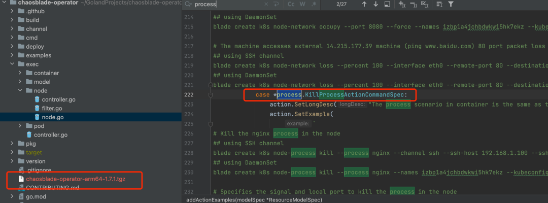 • 同时如果你想把这个基础资源的实验:杀死进程扩展到云原生node、pod、container 场景中,还需要修改operator仓库,重新编译打包 chaosblade-operator-1.7.1.tgz, 如下图: