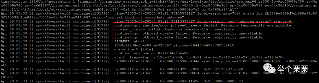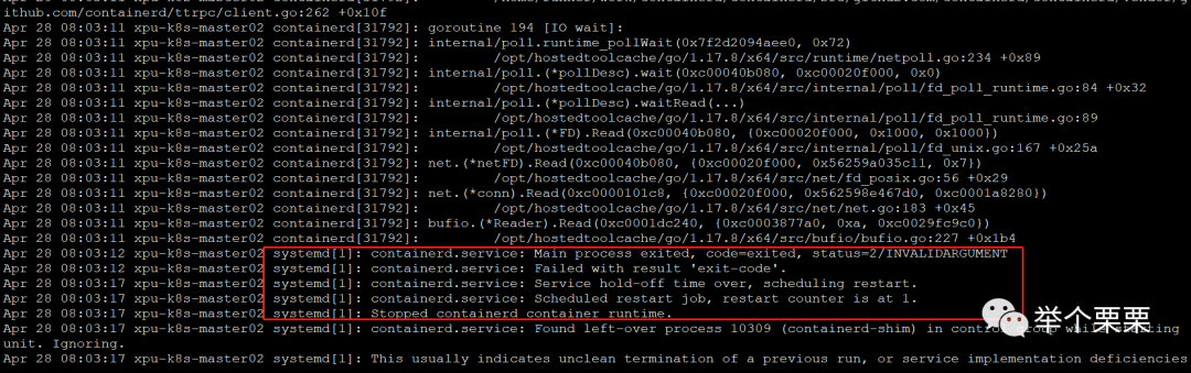马上查看K8S集群节点的状态,发现这个节点已经是NotReady状态了。第一反应就是ping下节点看是否宕机了?ping正常,于是登录到该节点查看kubelet状态。发现kubelet报runtime不可用,查看containerd的状态,一直在不断的重启,而且启动不成功。为了尽快恢复业务,决定先将containerd的数据目录清空后重新拉起。于是删除containerd数据目录下的文件夹:
